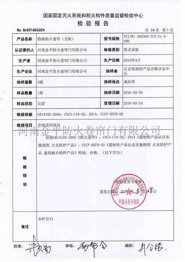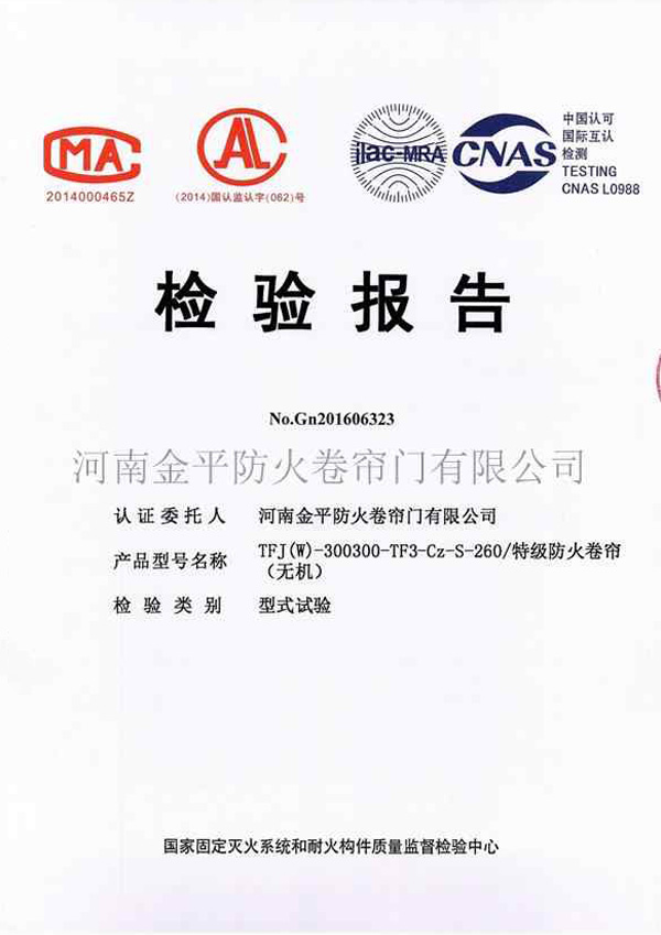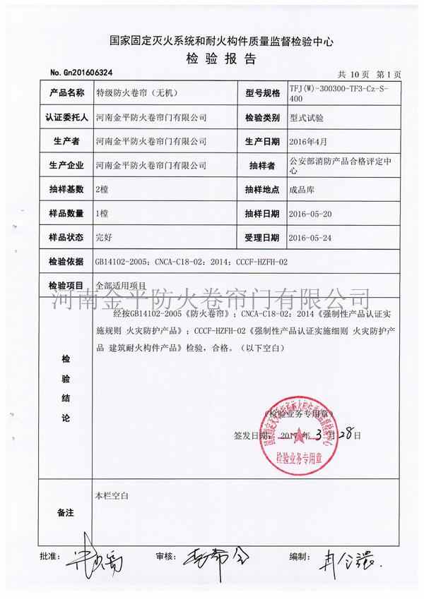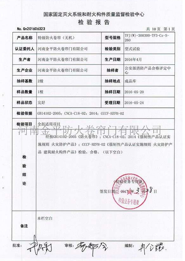 特級(jí)防火卷簾(無機)檢驗報(bào)告